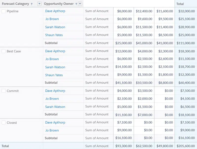 Likewise, if you have different opportunity stages for different types of deals (for example, new sales versus renewals), this is also an excellent way to summarize sales forecast reports for the senior management team.