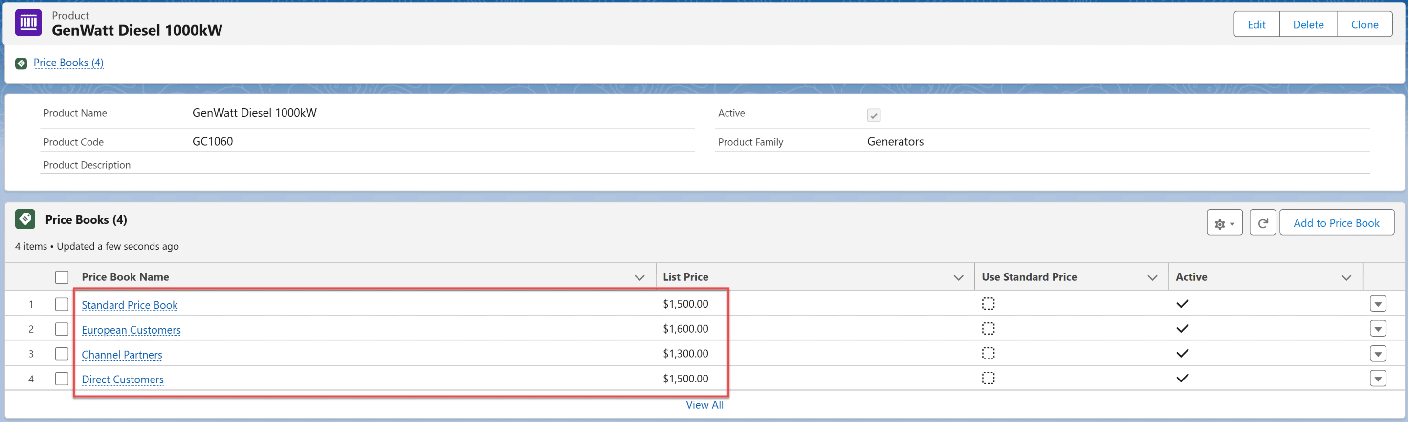 - Each product in a custom price book either uses the standard price, or the price you assigned to that specific price book.