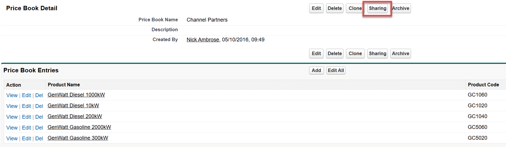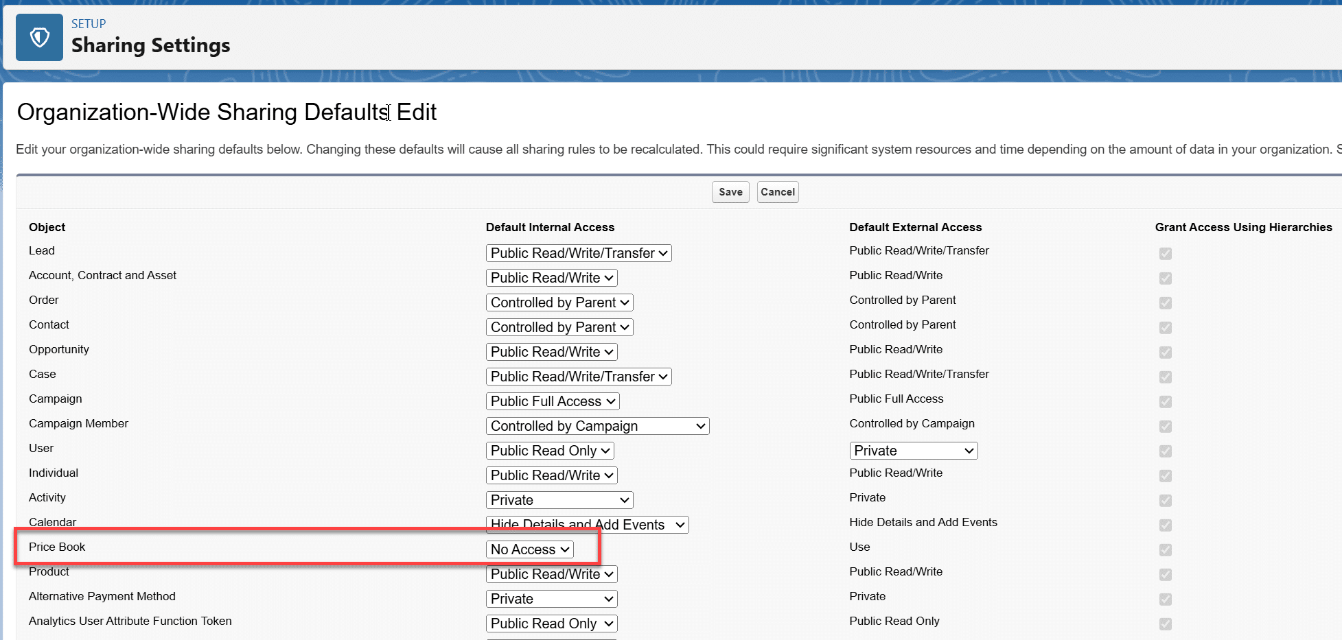 - Set the Organization-Wide Sharing setting for Price Books to View Only or No Access.