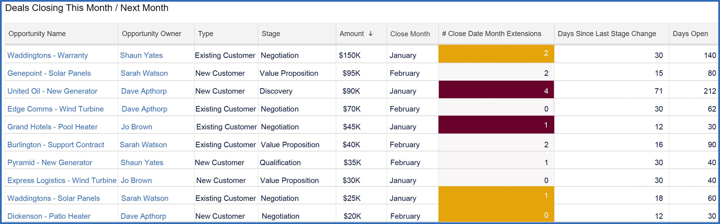Use the Deals Closing This Month/Next Month table to validate your short-term pipeline and establish the basis for accurate pipeline coverage metrics.