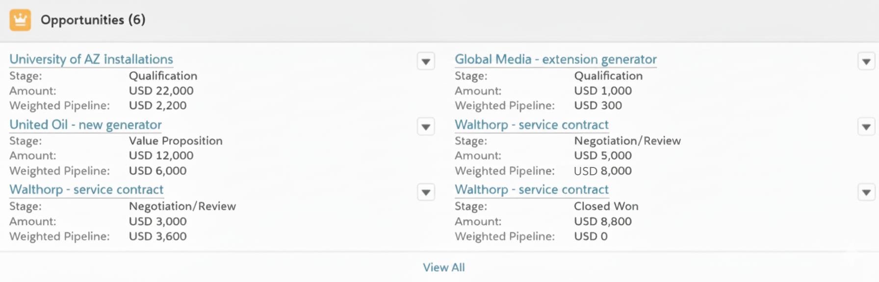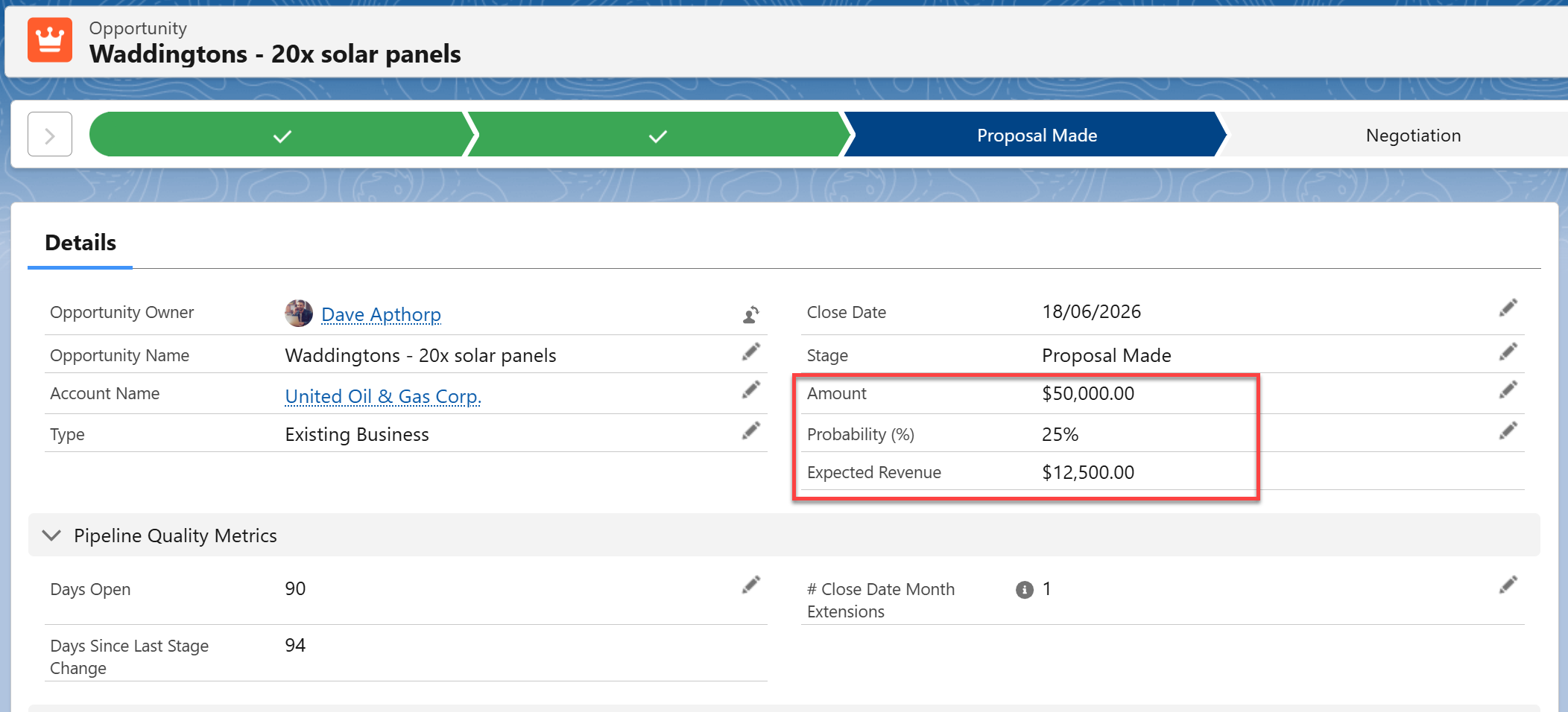Further down the page, we see the opportunities that make up the pipeline.