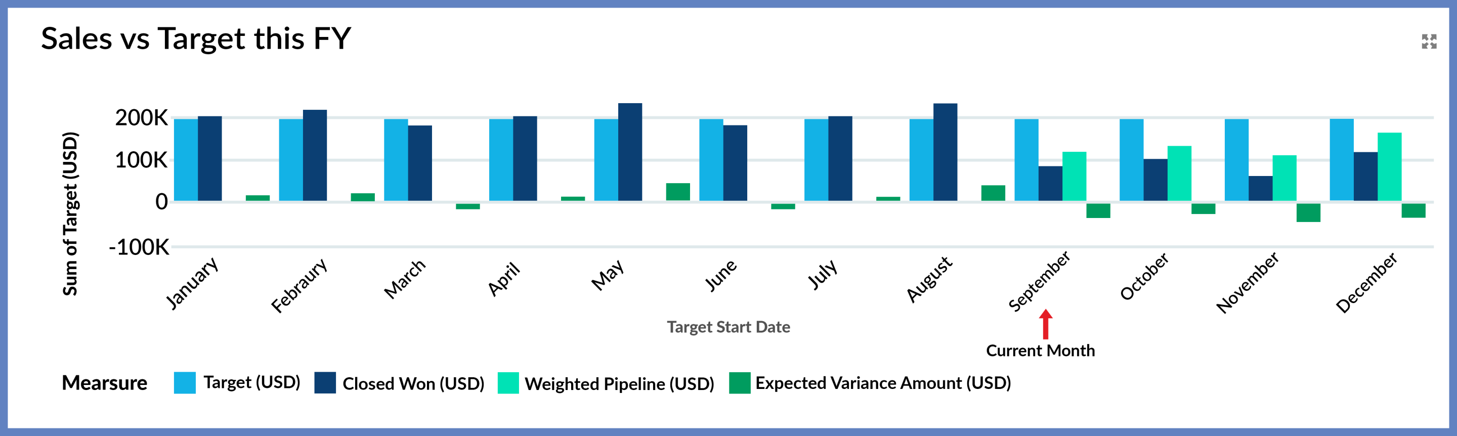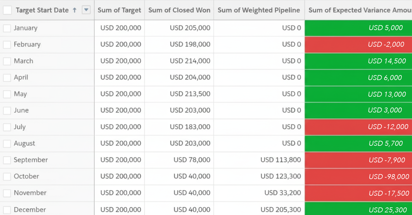 The Target Tracker is a powerful tool for measuring pipeline coverage based on the opportunity amount, and it can quickly adapt to use custom opportunity fields. You can also implement quarterly or annual targets instead of monthly targets.