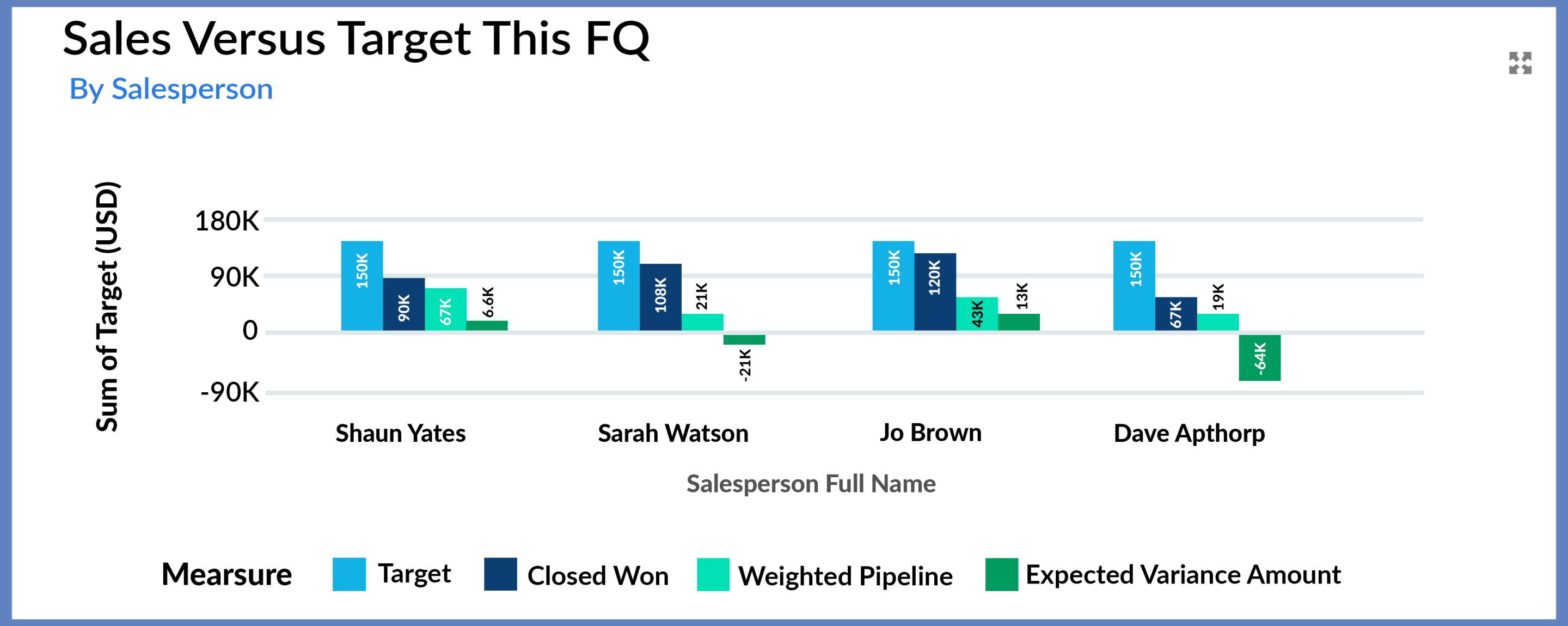 For example, this dashboard shows the performance of all salespeople in the current quarter.