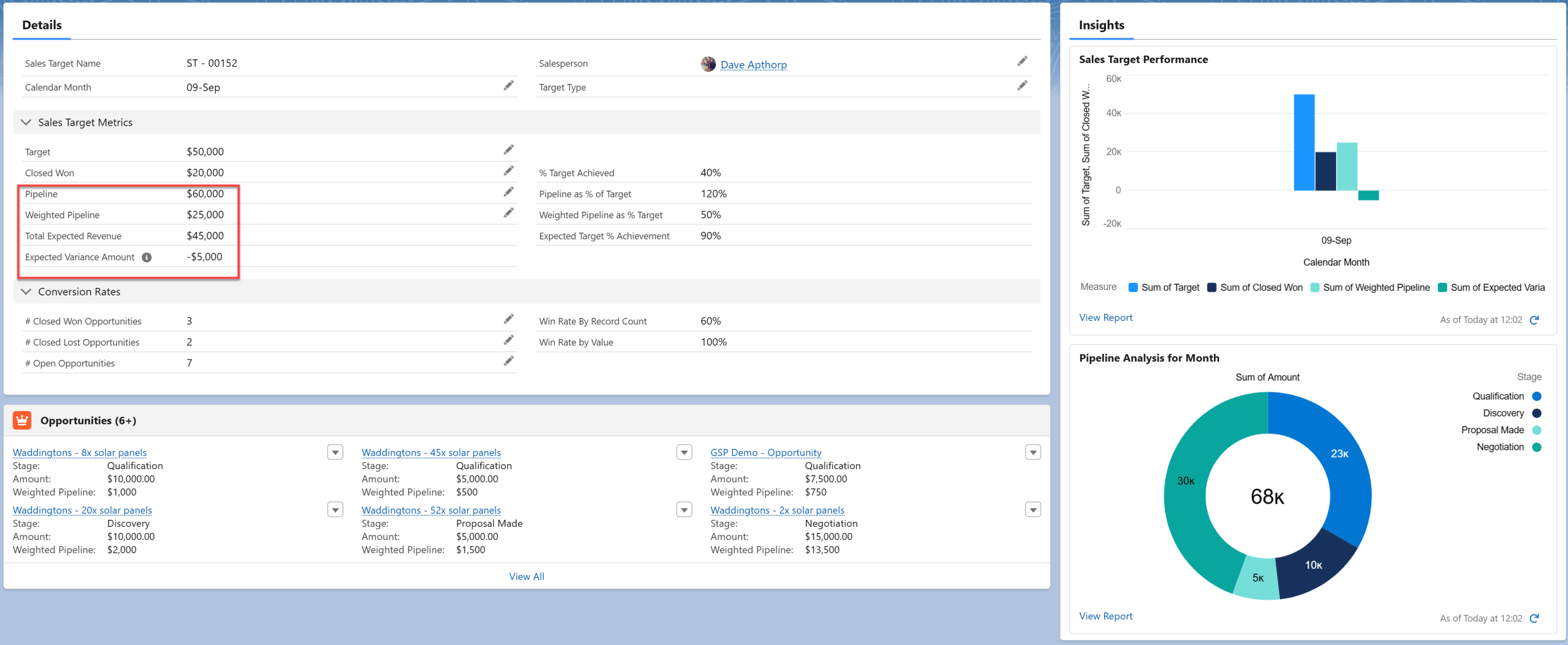 We can see that Dave’s target is $50,000. He’s already won $20,000 this month. The value of his pipeline, which is due to close in September, is $60,000.