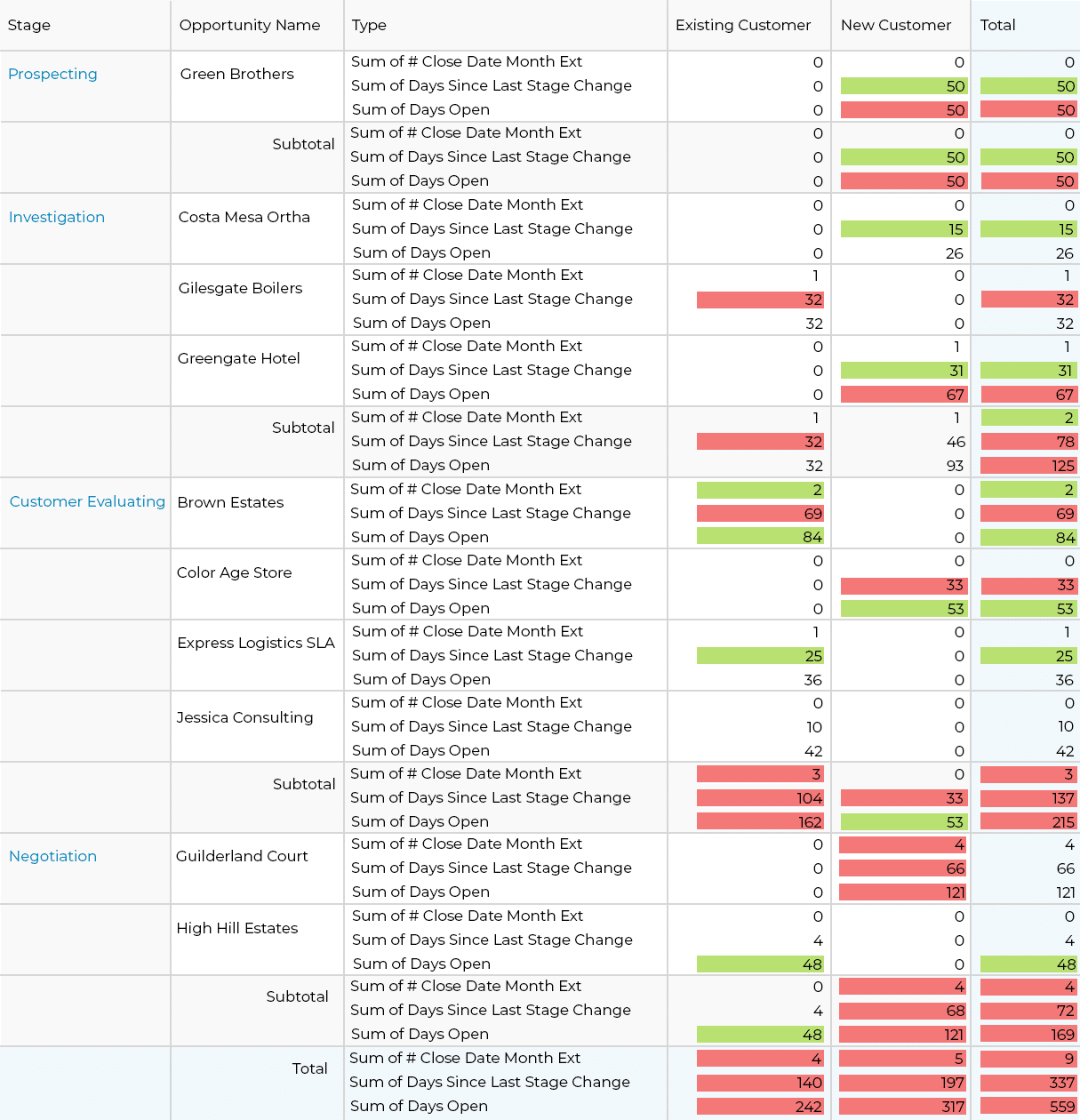 For example, imagine your average sales cycle is 3 months. You have a deal due to close this month, and it’s making a vital contribution to your revenue forecast. But the Close Date has already slipped by one month 4 times. And while it’s now in the final Negotiation Stage, it’s been there for over 2 months – plus, the Opportunity has been open for 180 days.