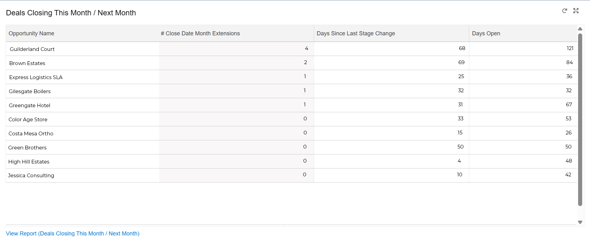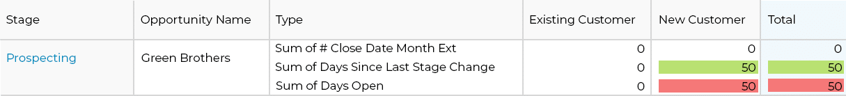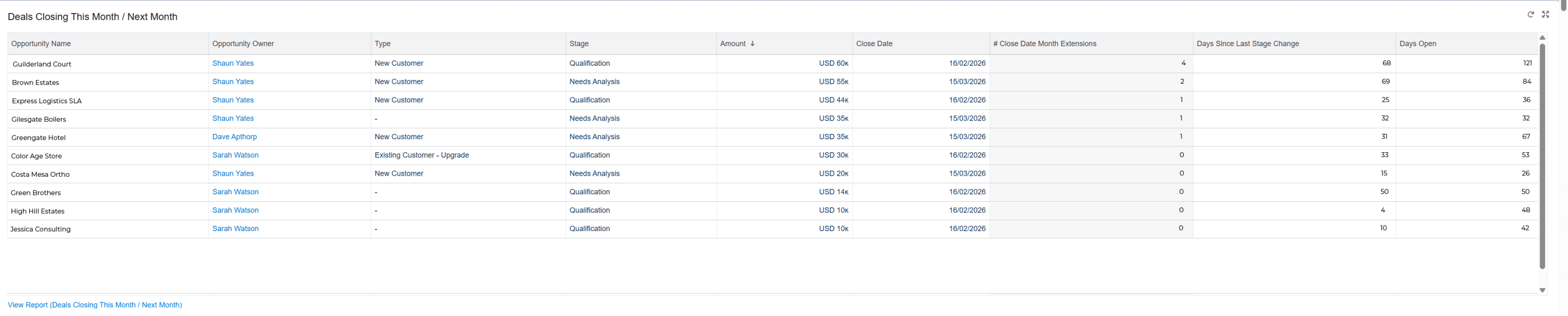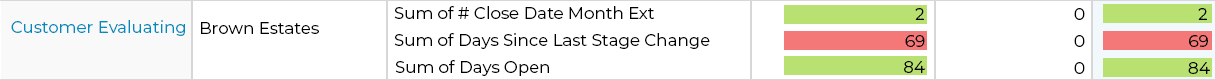 However, the Stage hasn’t changed, indicating the deal has not progressed since the salesperson first opened it. If we assume the opportunity is in the correct Stage and there’s no sandbagging, you should be cautious about whether it will close this month.