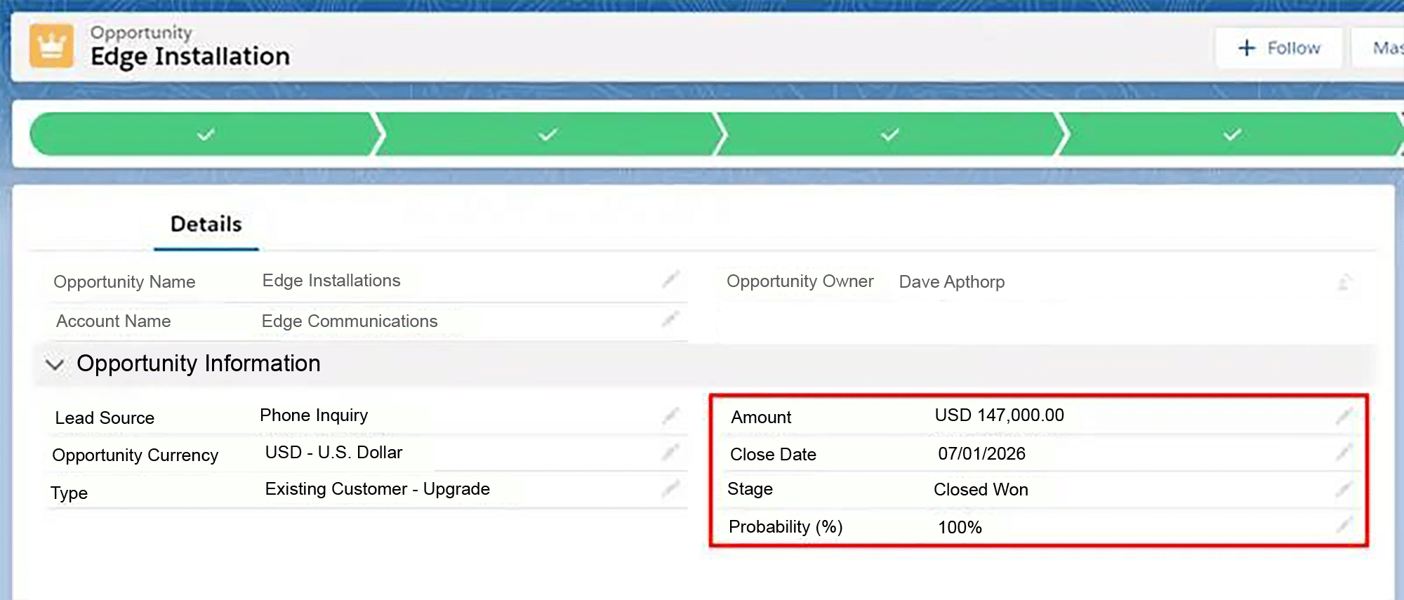 - All schedules update automatically when the opportunity changes. For example, if the Close Date moves, the schedules also move without extra work for the salesperson.