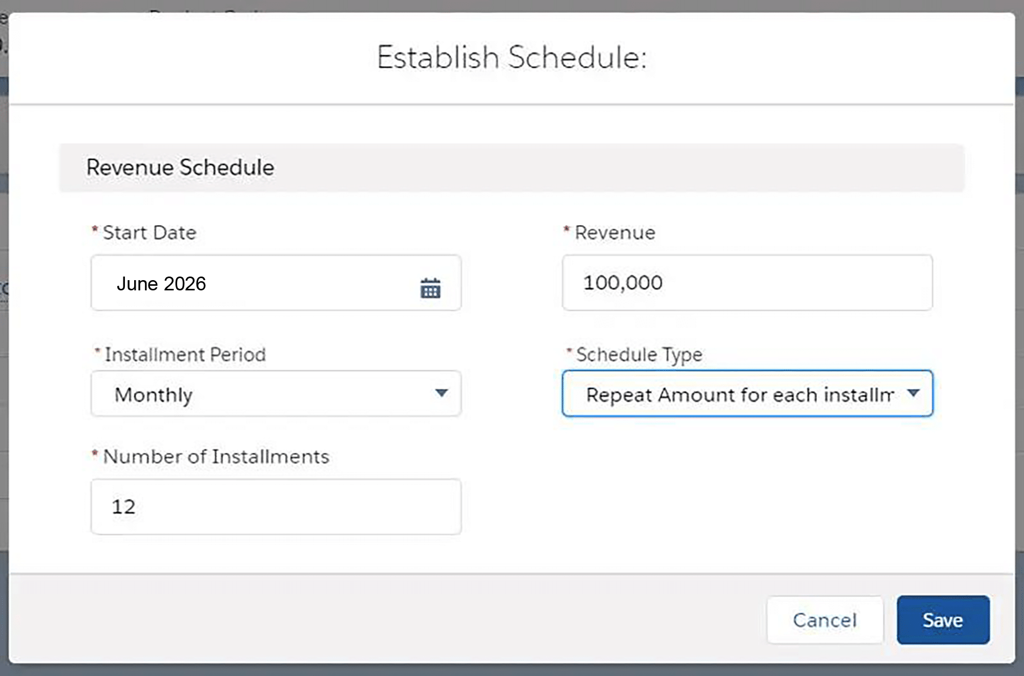 - Salespeople cannot create revenue schedules while adding the product; they have to add them afterward.