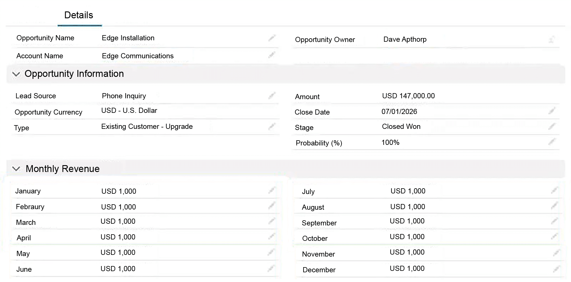 You can see the standard Quantity and Sales Price fields. However, this time there are also have two new fields: Revenue Start Date and # Revenue Months.
