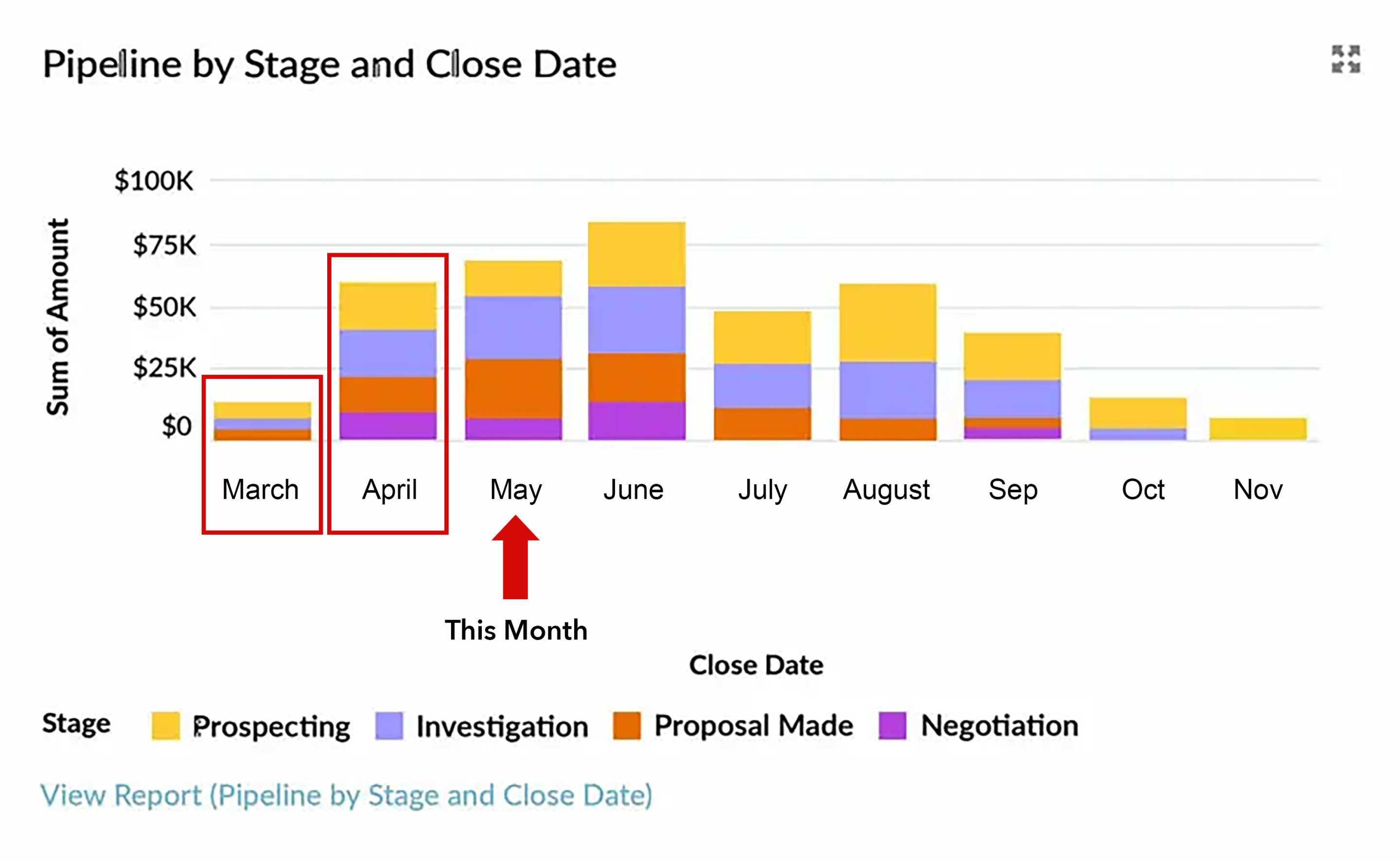 The Opportunity Stages with Close Date report gives you essential information for assessing pipeline health and correcting glaring errors in your sales forecast.