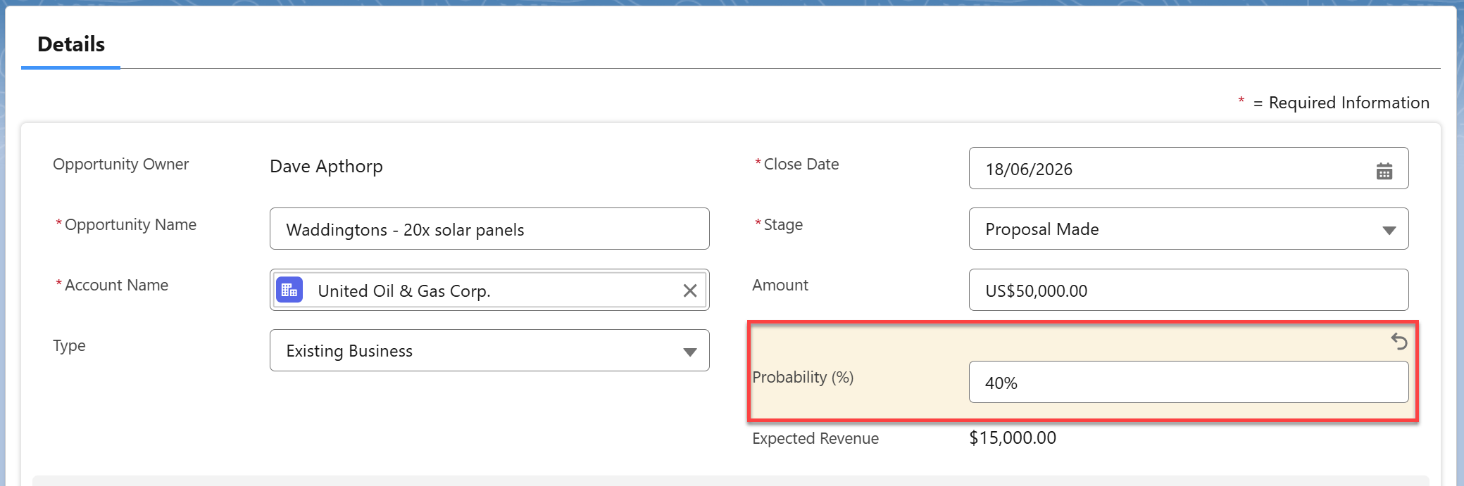 However, the correct probability for a new customer might be lower, yet the chances of winning a deal with an existing, long-term strategic customer may be higher. So, we can manually adjust the probability when the default value isn't appropriate.