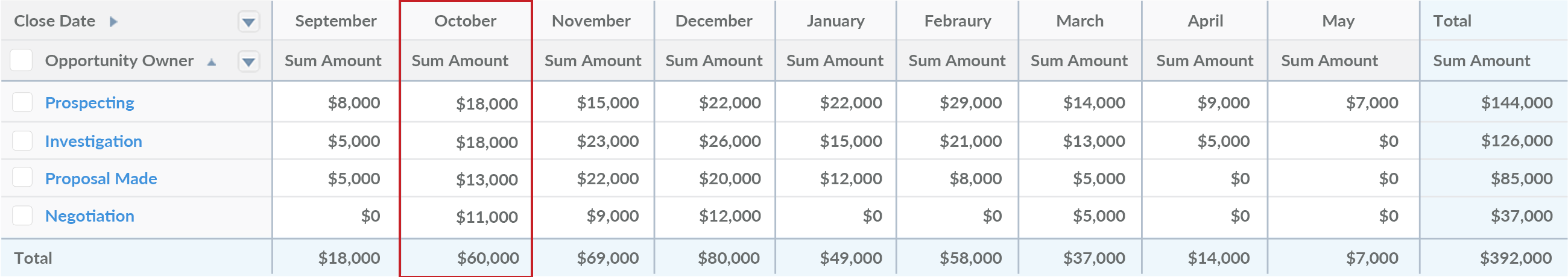 The same is true of opportunities in the Investigation and Proposal Made stages. If you’re unlikely to close them this month, your October pipeline is significantly overinflated.